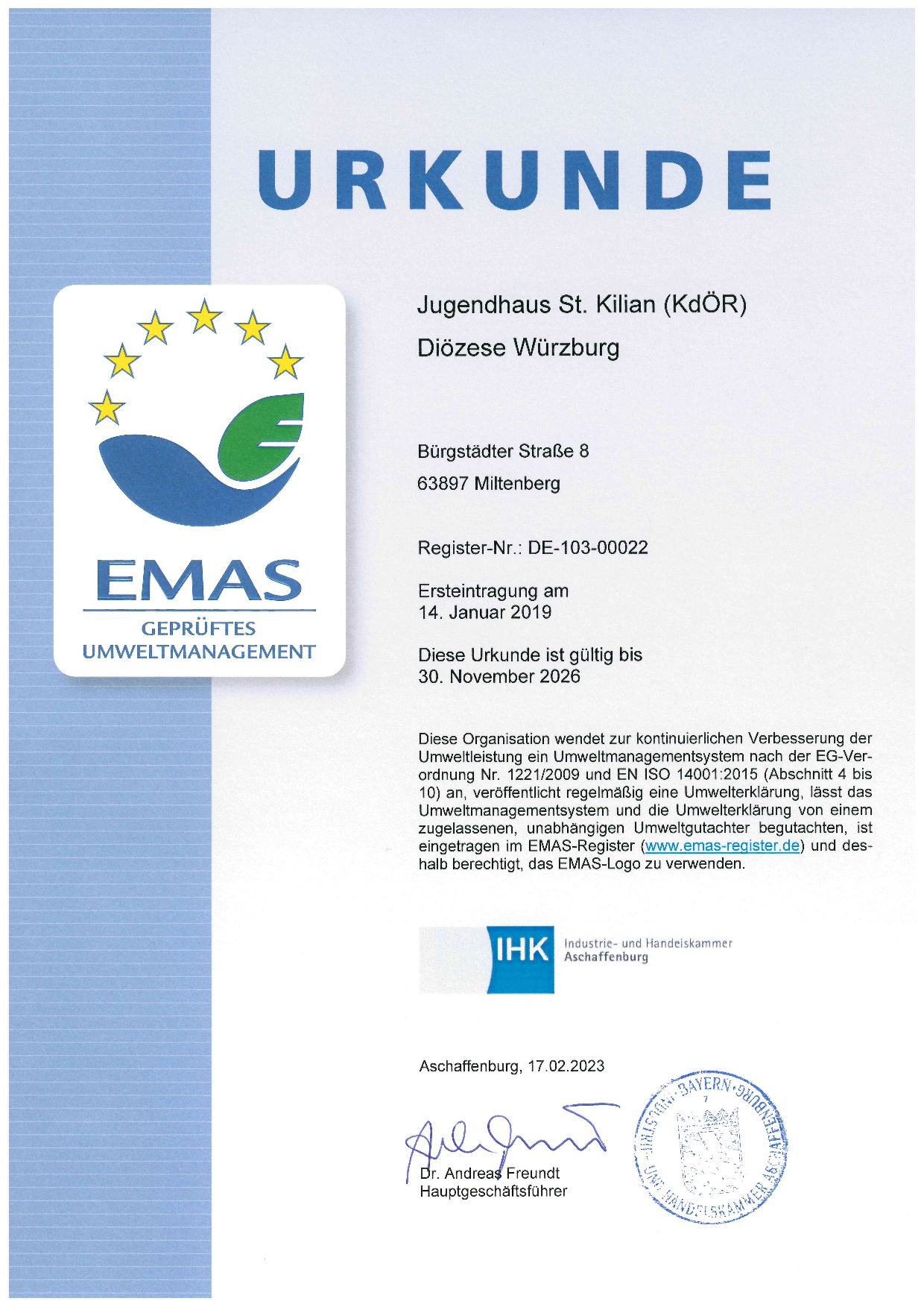 Seit dem 17. Januar 2019 ist das Jugendhaus St. Kilian mit dem Umweltgütesiegel EMAS ausgezeichnet. EMAS steht für Eco-Management and Audit Scheme und ist ein international anerkanntes Umweltmanagementsystem, welches auf der freiwilligen Selbstverpflichtung beruht, den Umweltschutz im eigenen Unternehmen kontinuierlich zu verbessern und die Organisation im Hinblick auf ökologische Anforderungen der Zukunft vorzubereiten. EMAS wurde im Jahr 1993 von der Europäischen Union eingeführt. Regelmäßig wird das Umweltmanagement des Betriebs durch externe akkredierte Gutachter überprüft. Weitere Informationen zu EMAS findet ihr unter www.emas.de.